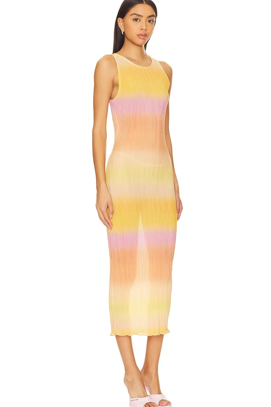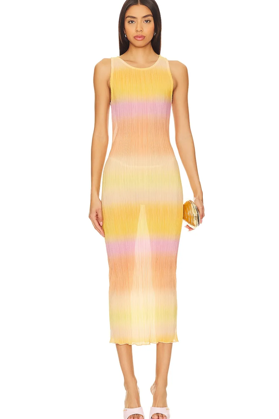- Introducing the Lovers and Friends Giada Sheer Midi Dress – a mesmerizing piece with a rainbow ombre color design. This midi dress, with its semi-sheer fabric and tank silhouette, seamlessly blends sophistication and playful allure. Embrace the vibrant charm of the Giada dress for a look that captivates with every step.