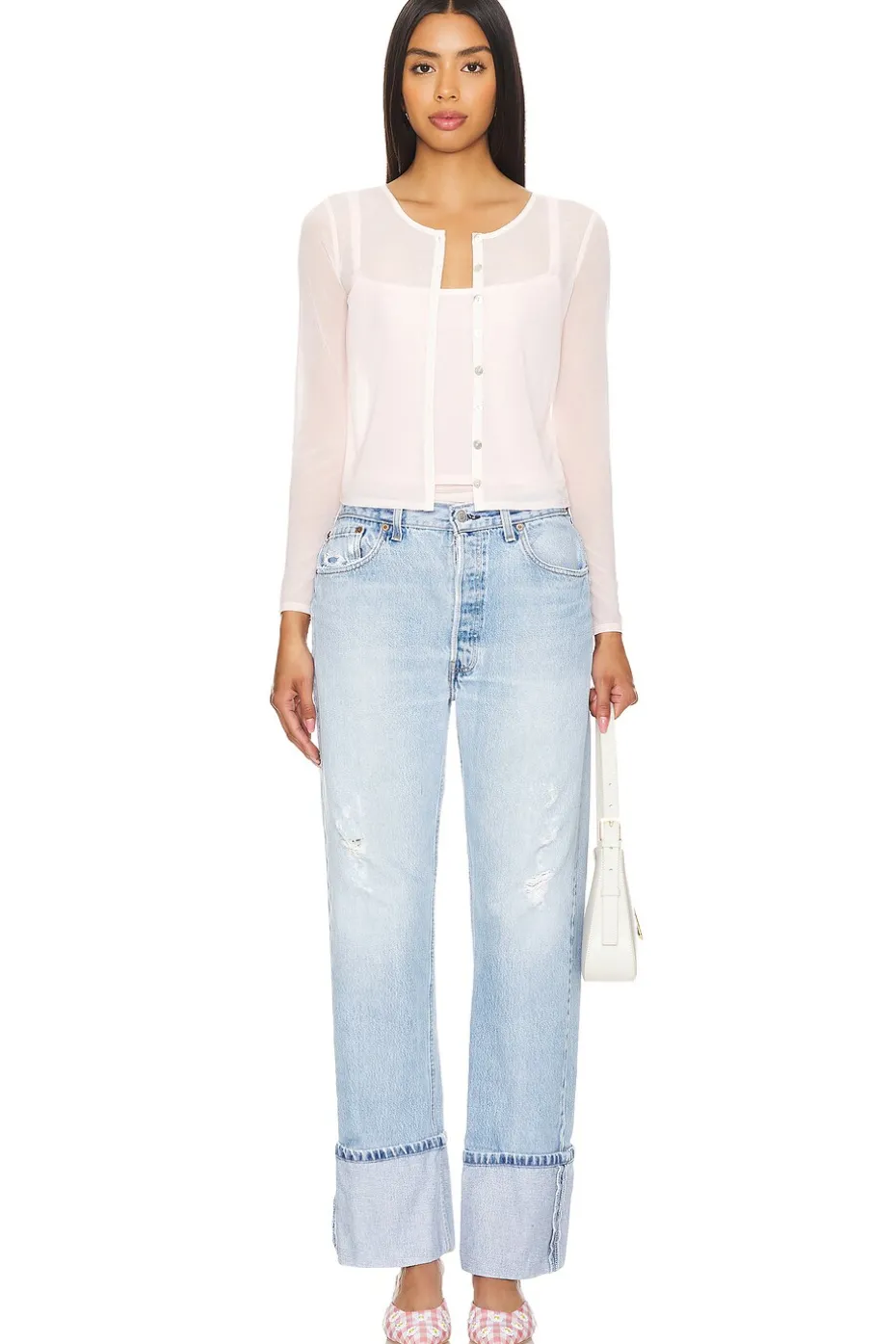 - Garment is made with a semi-sheer fabric, undergarments can show through