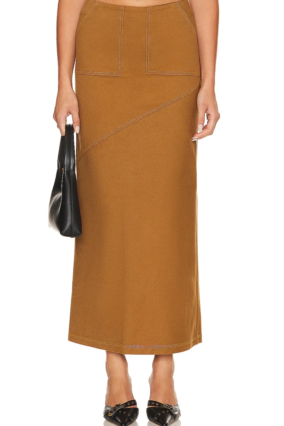 - Step out in the Lovers and Friends Cal Skirt in Khaki – a versatile and stylish piece that effortlessly combines comfort with sophistication. Crafted from twill fabric, this skirt offers a sleek and polished look, perfect for dinner with friends or any casual outing. Complete the ensemble by pairing it with the matching top, creating a chic and coordinated outfit.