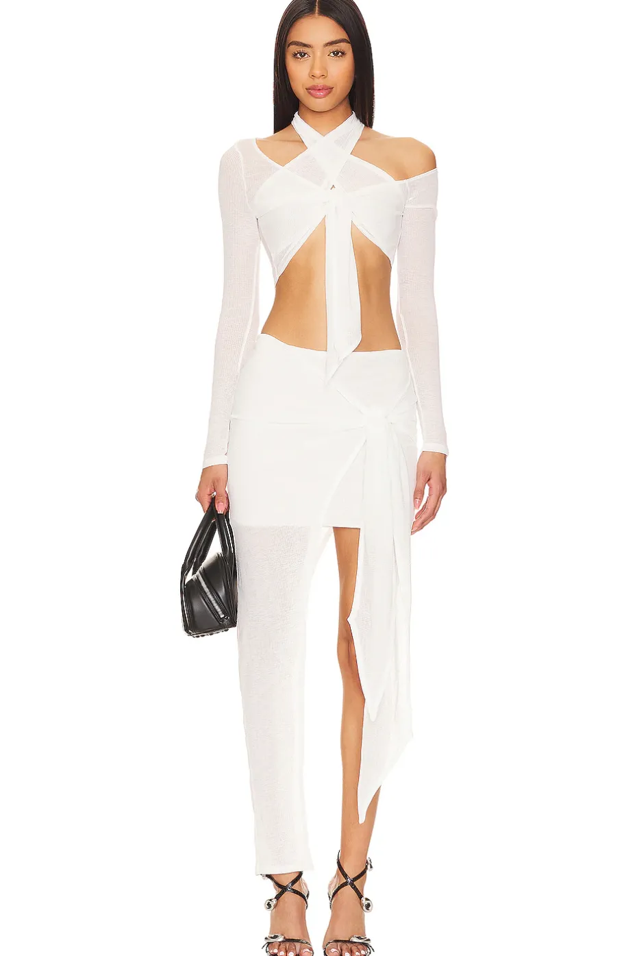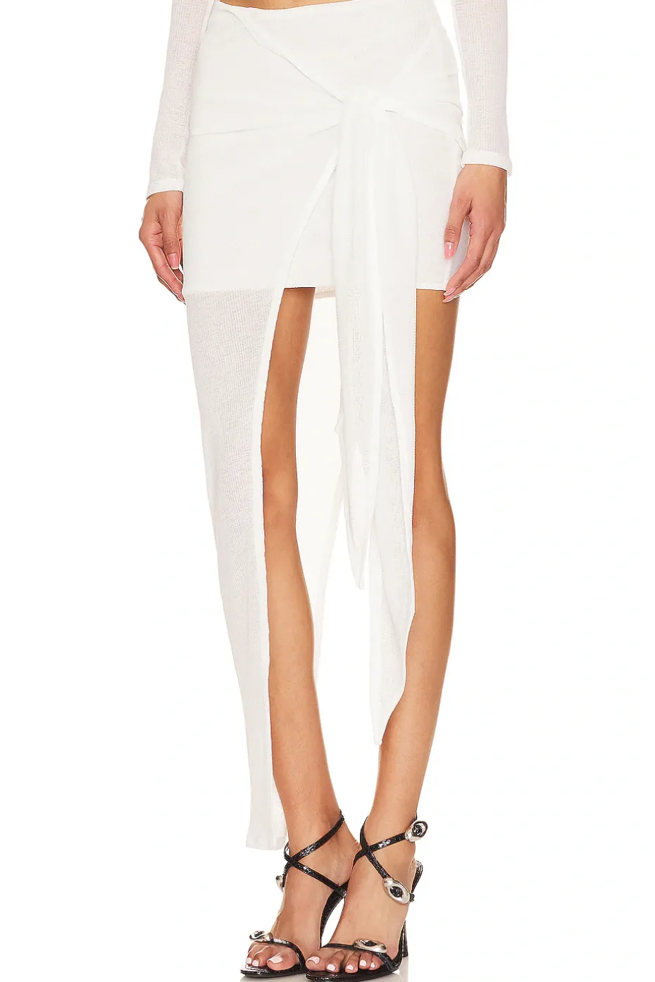 - This essential midi skirt features a longline silhouette with an asymmetrical design and a knotted detail at the side. Elevate this piece with strappy heels or unexpected with moto boots, Pair it with matching top (sold separately) for a one-of-a-kind look.