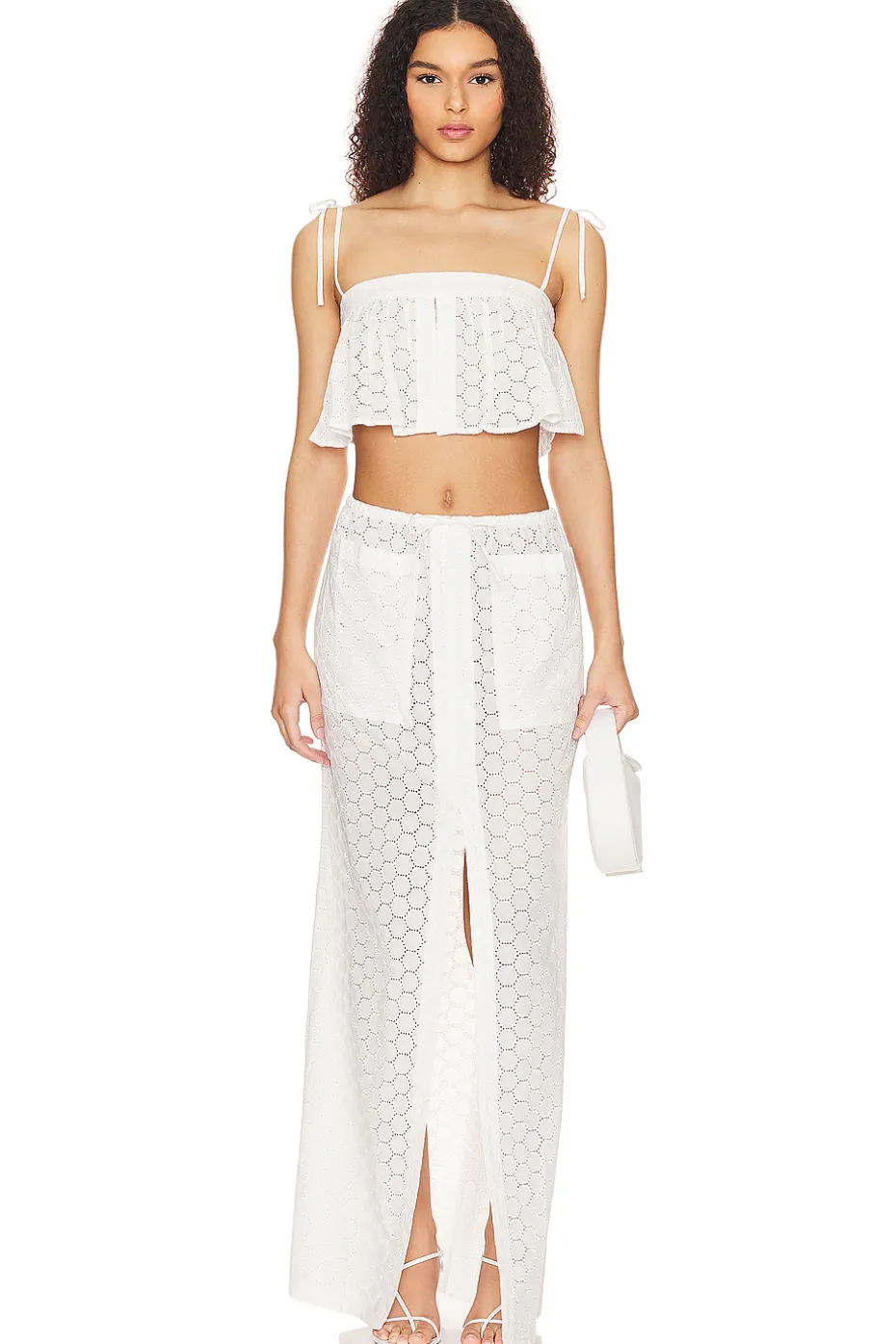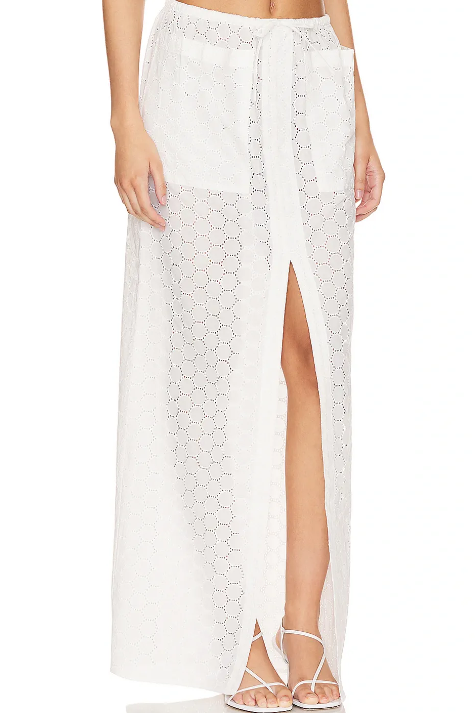 - Step into ethereal elegance with Lovers and Friends Fiona Maxi Skirt in White. Crafted from delicate eyelet fabric with a flirty front slit, this skirt exudes girly charm. With pocket details and a drawstring waist, it’s both practical and stylish. Complete the look by pairing it with the Fiona Top in White. Don’t miss out on this dreamy ensemble.