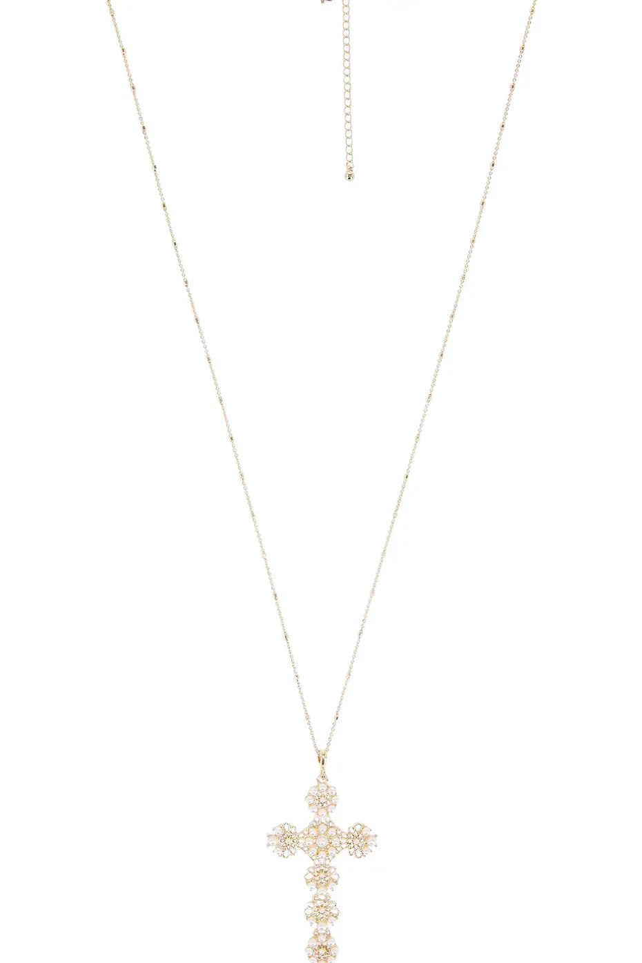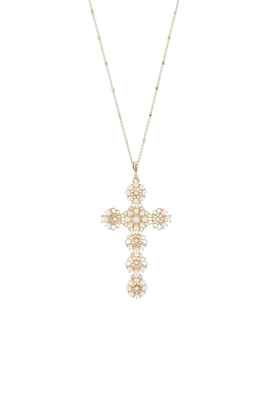 - Gold-tone metal with faux pearl-embellished cross pendant
