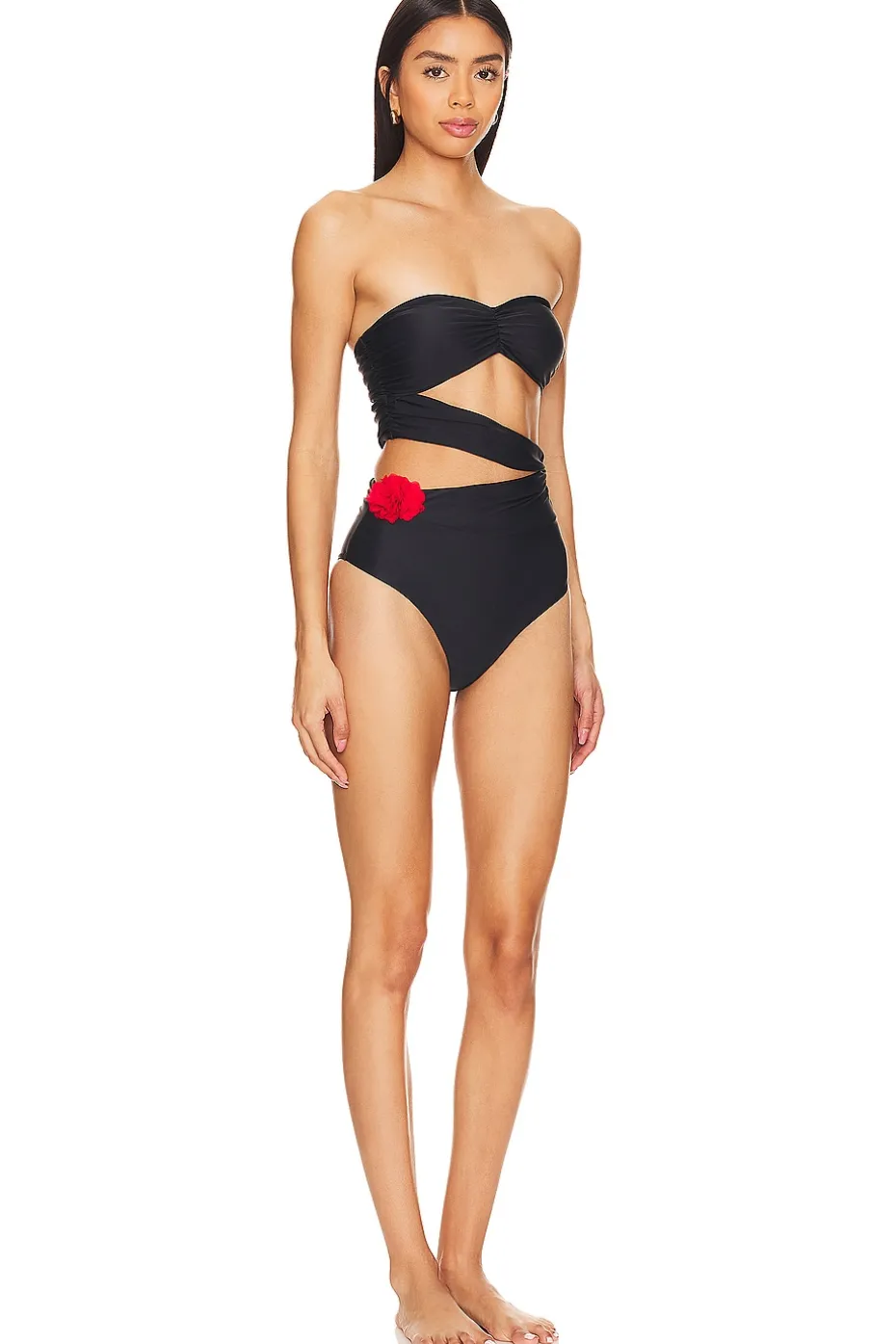 - Swimwear seduction is yours with the Lovers and Friends Lima Strapless One Piece in Black & Red. Unleash sultry vibes with captivating cut-outs and strapless allure. Crafted from jersey fabric with a rosette embellishment, this swimwear stunner is vacation-ready. Embrace romance in black and red – your rose elegance awaits.