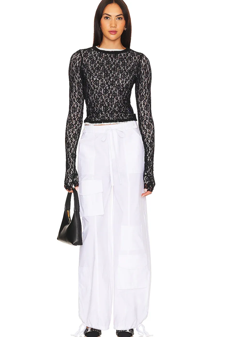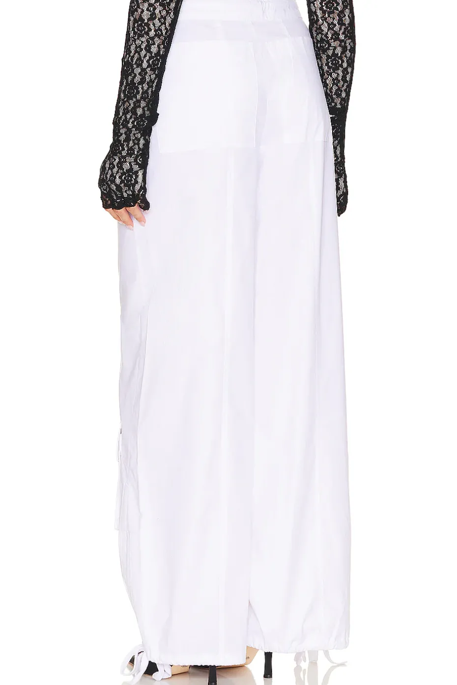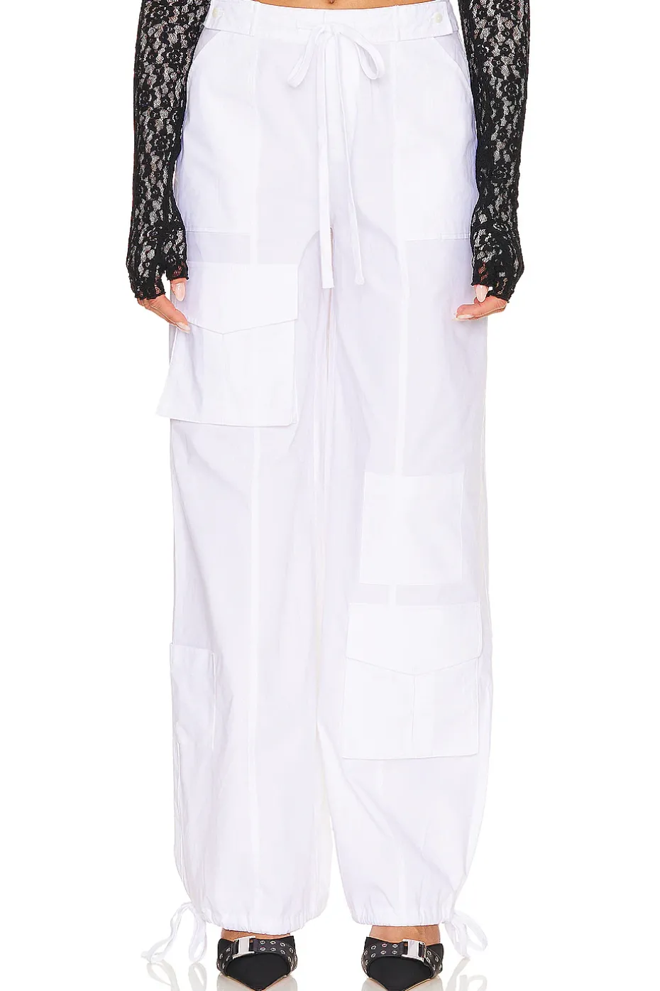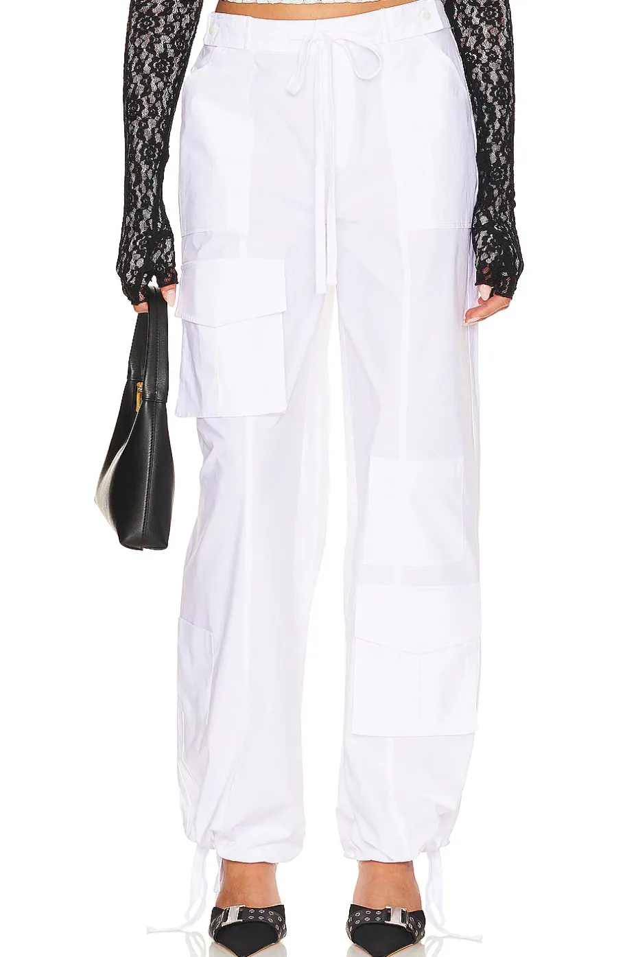 - Enhance your casual style with the Lover and Friends Maci Cargo Pant in Bright White for those laid-back yet stylish evenings. These cargo pants feature a comfortable drawstring closure and are crafted from poplin fabric, offering a breezy and stylish option for your night out. Versatile and easy to pair with heels or sneakers, these pants will ensure you to stay on-trend while enjoying a relaxed and fashionable look.