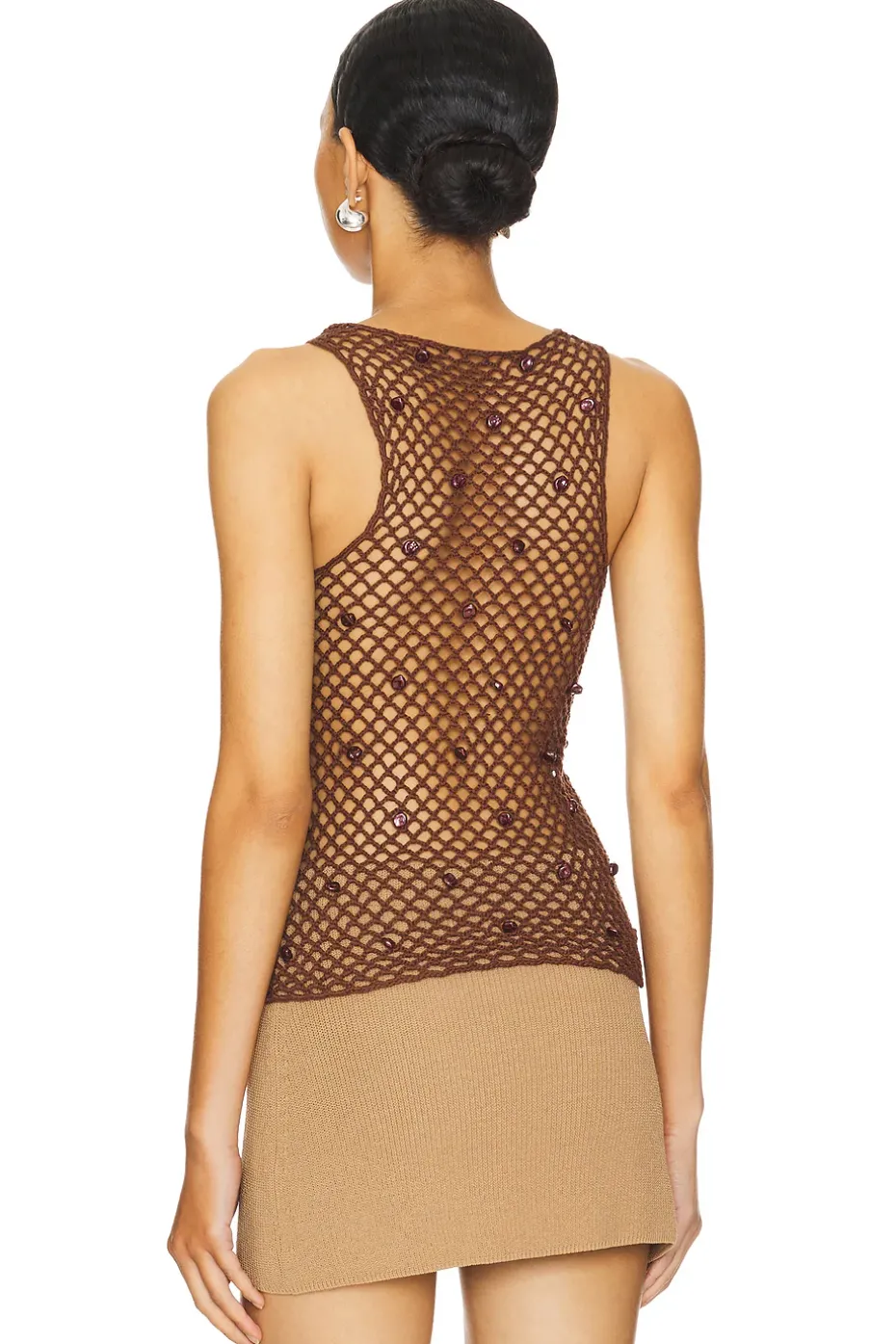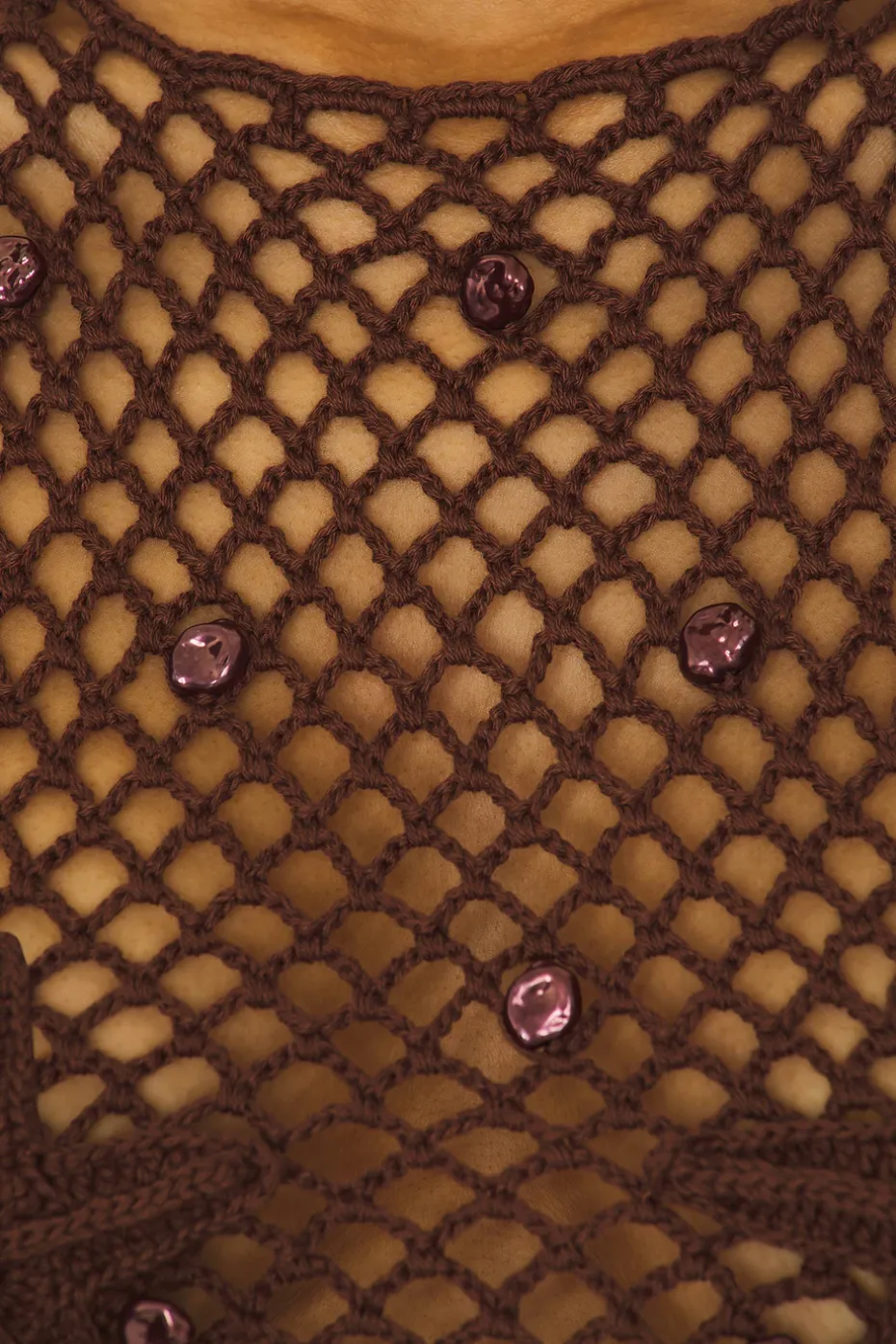 - Open knit crochet knit fabric with faux baroque pearl charms