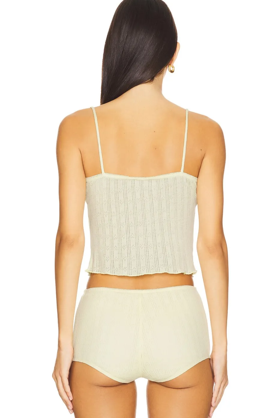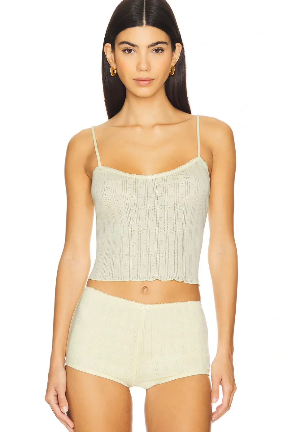 - Pointelle knit fabric with eyelash trim and satin bow accent