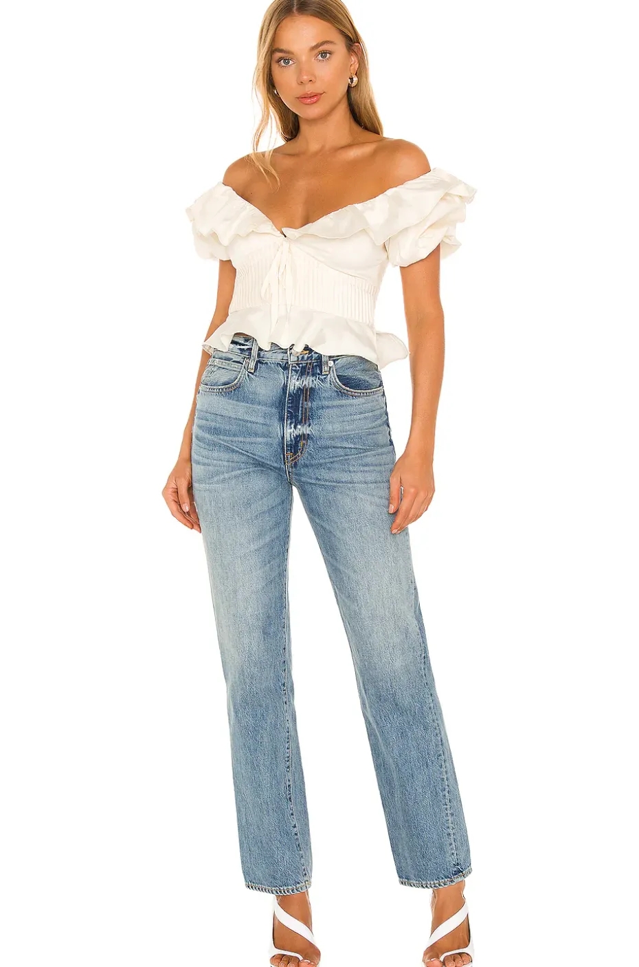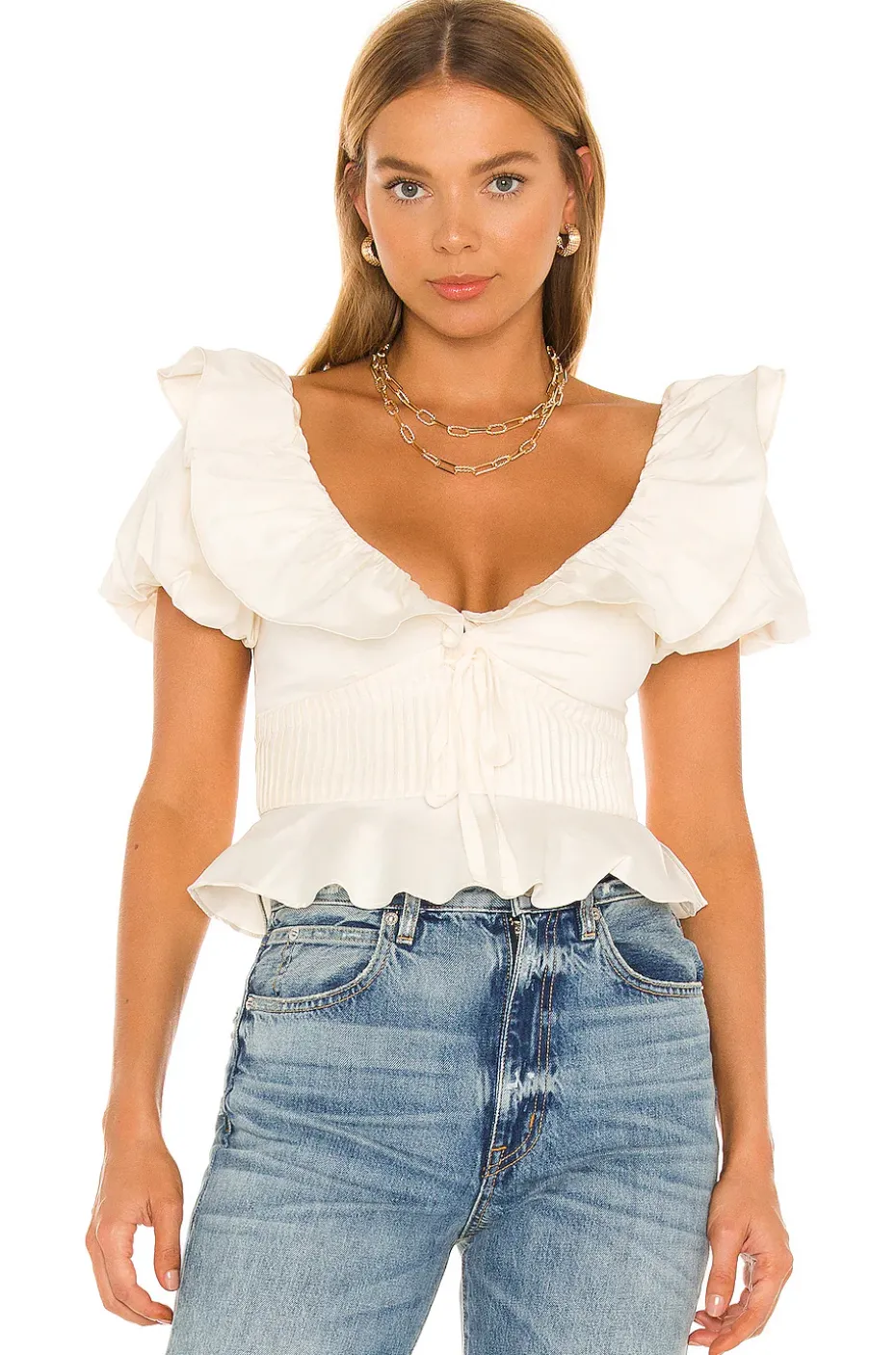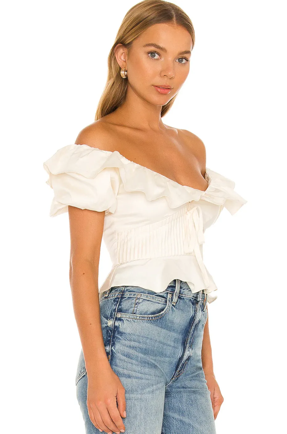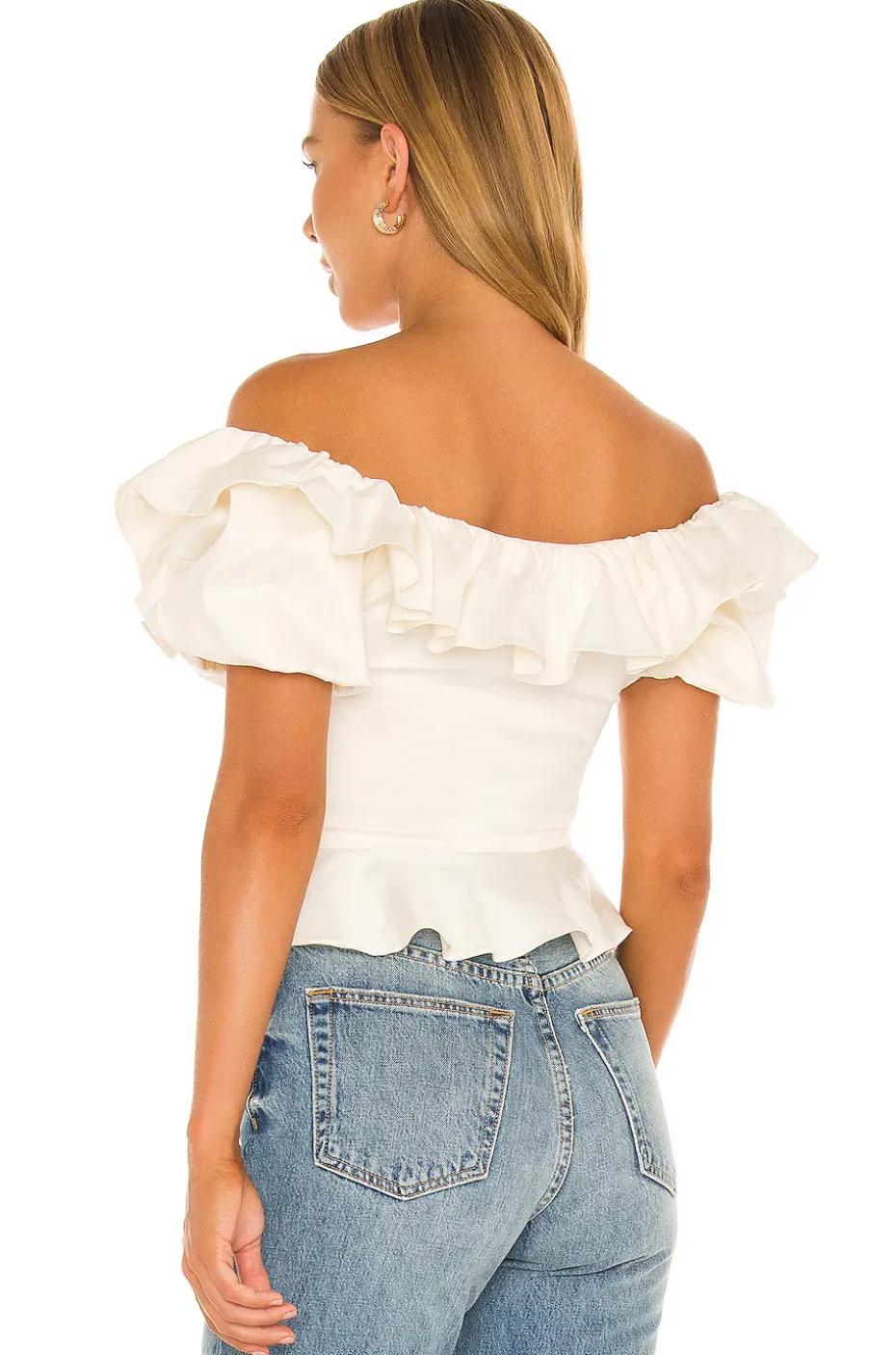 - Off the shoulder styling with ruffled overlay