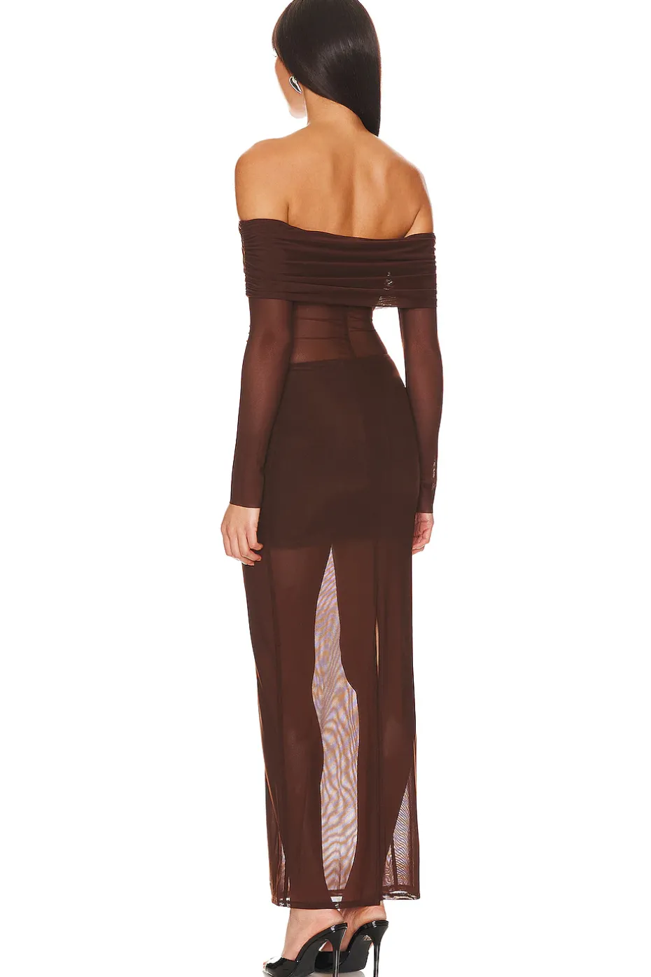 - Introducing the Lovers and Friends x Anja Dujaković Fio Maxi Dress in Chocolate Brown. Elevate your style with its foldover off-the-shoulder neckline and mesh fabric. The rich chocolate brown hue adds allure, making it the perfect choice for the cold weather season. This dress embodies understated elegance, ensuring a sophisticated look for any formal occasion.