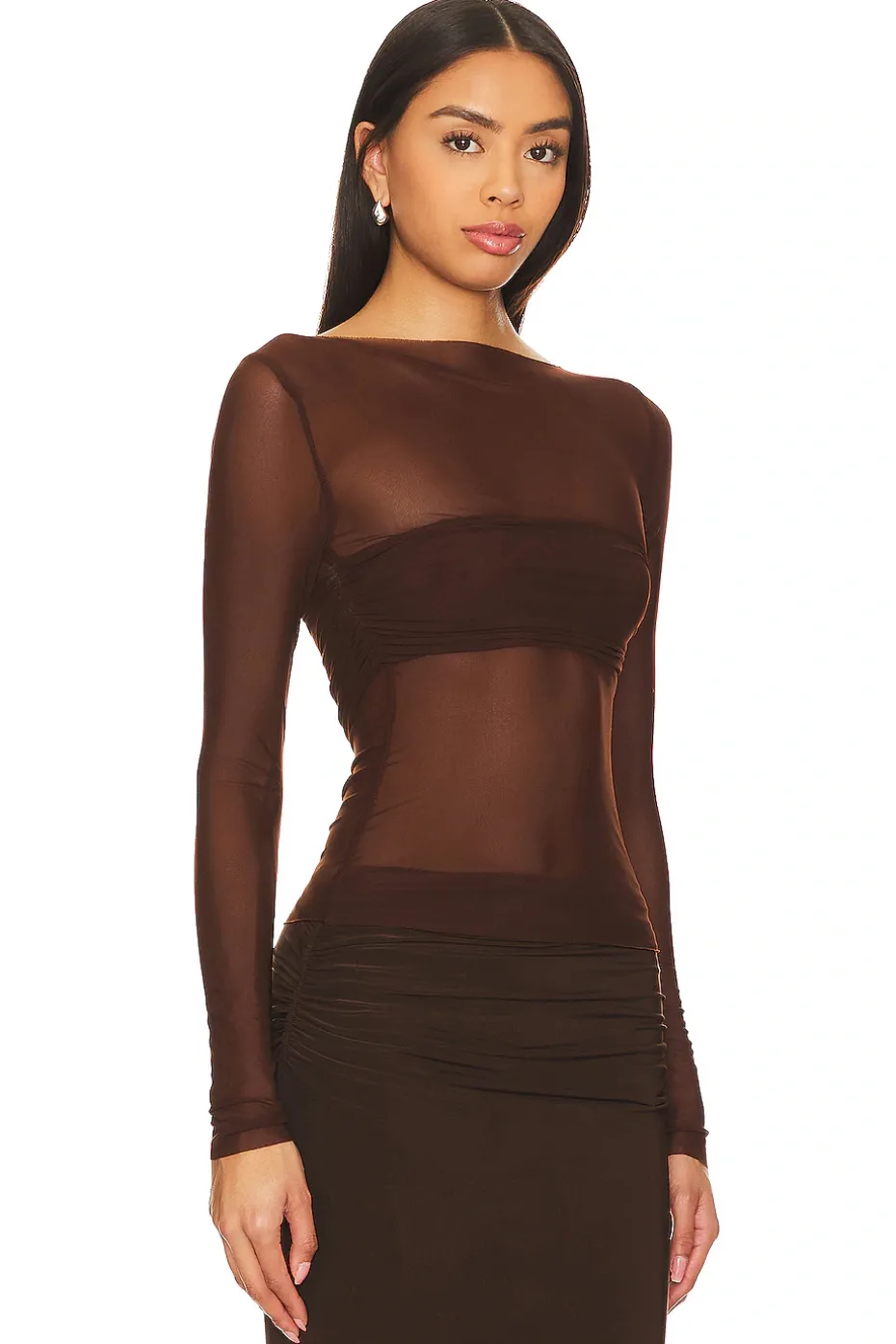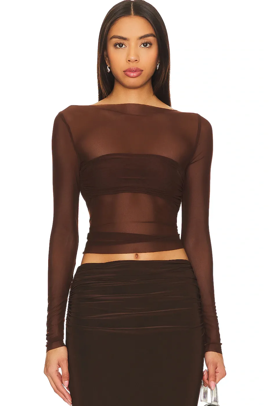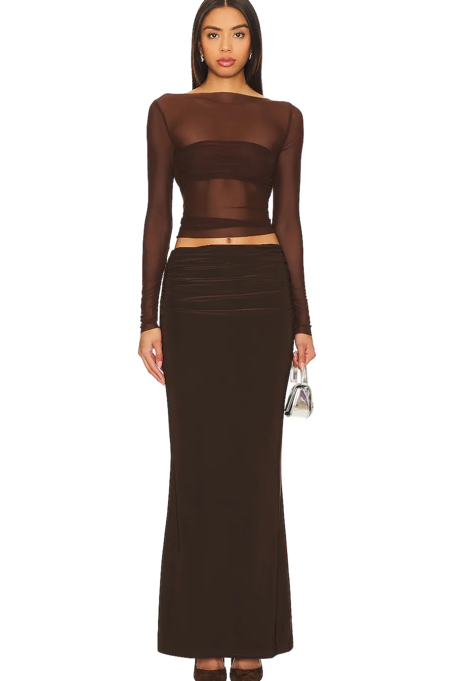 - Step into sheer elegance with the Lovers and Friends in collaboration with Anja Dujakovic Fio Maxi Skirt in Chocolate Brown. This mesh skirt, featuring a lined bandeau, exudes understated chic for a stylish allure. Perfect for going out, it’s your ticket to a night of unparalleled glamour.